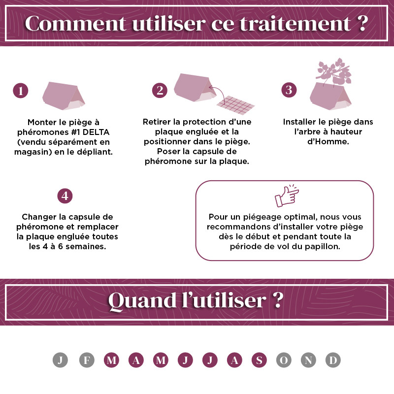 Chaque ravageur est attiré par un type de phéromone. Une fois attirés par la phéromone, les insectes sont alors pris dans un piège et ne peuvent plus causer de dégâts aux plantes et aux arbres !