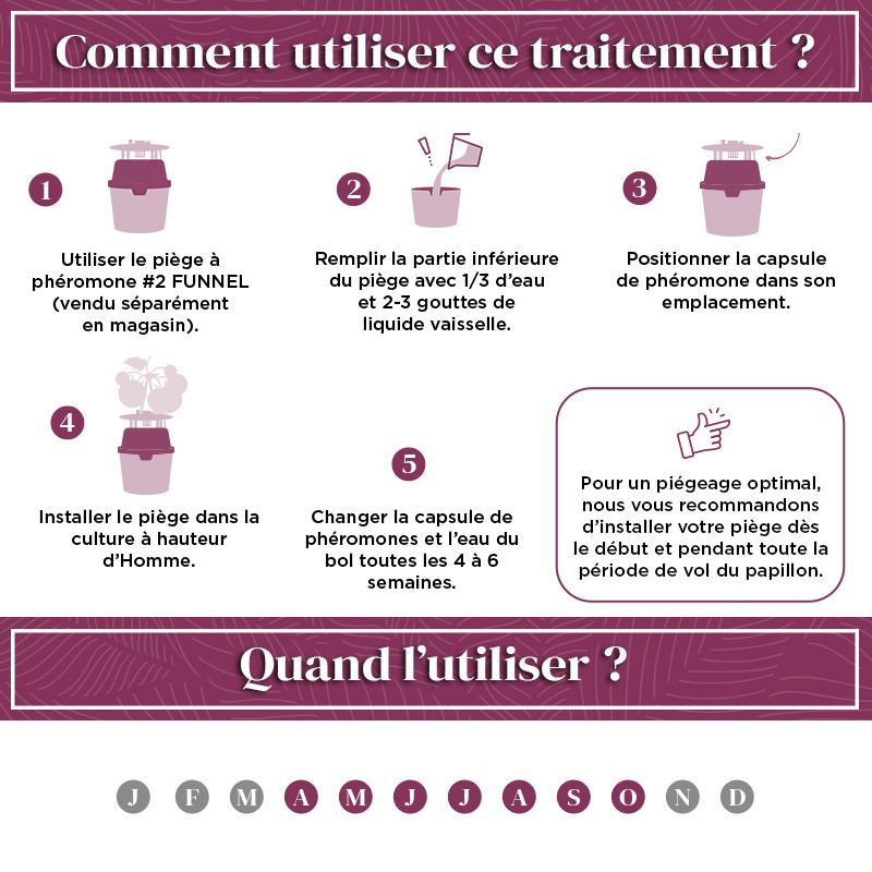Chaque ravageur est attiré par un type de phéromone. Une fois attirés par la phéromone, les insectes sont alors pris dans un piège et ne peuvent plus causer de dégâts aux plantes et aux arbres !