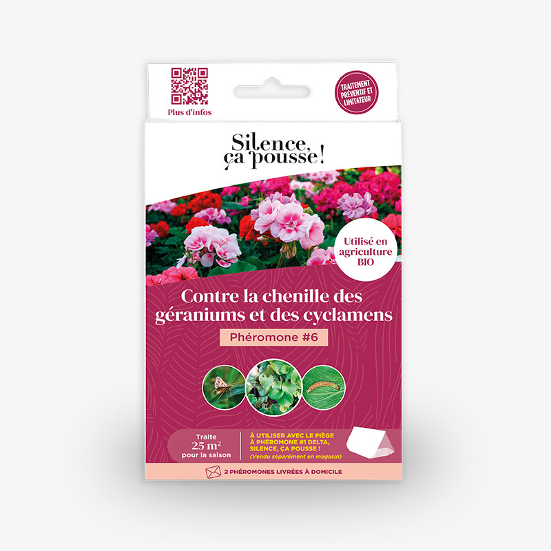 La phéromone #6 attire les papillons appelés Duponchelia fovealis dont les chenilles causent des dégâts sur les plantes ornementales (cyclamens, géraniums, azalées, bégonias...). Pour prévenir toute infestation, le piège se positionne à partir du mois de mars (selon le début des vols des papillons).